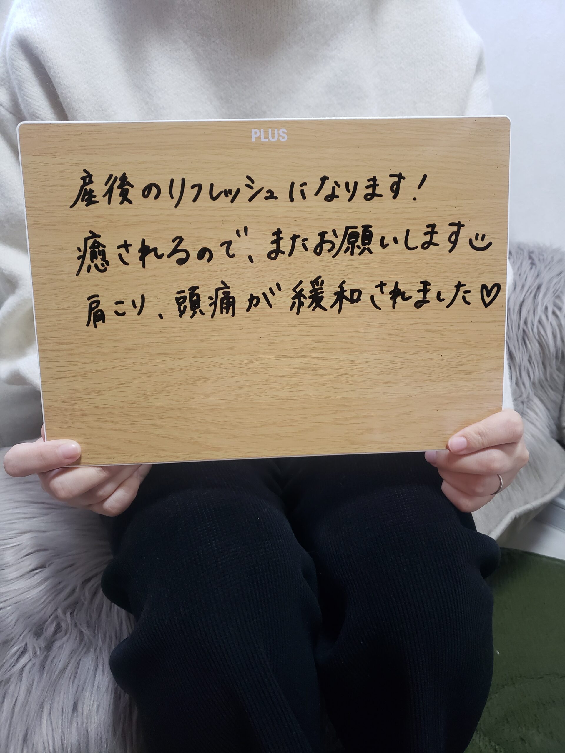 産後、偏頭痛になって体調がおかしいとのことでご来店。少しでもリフレッシュしていただけて良かったです!(^^)!